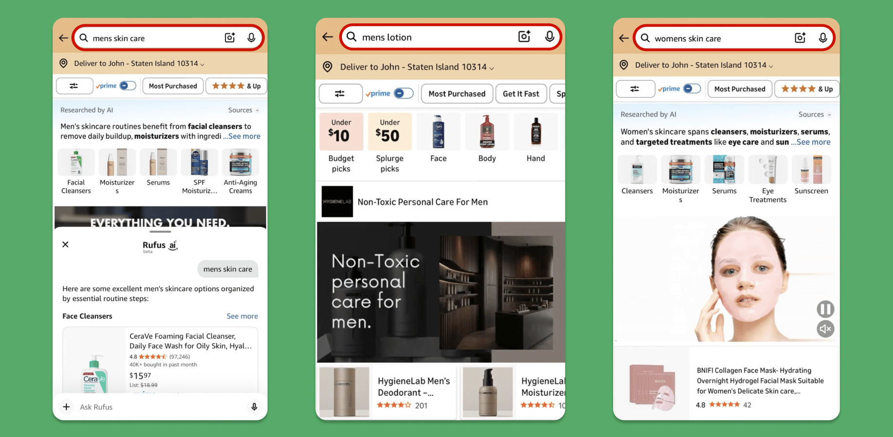 Amazon is improving product discovery with its AI assistant, Rufus. Specific searches such as "men’s lotion" display regular product grids, while broader queries like "men’s skin care" prompt Rufus to curate and label products as “Researched by AI.” This helps identify shoppers' purchase-ready versus research intents.