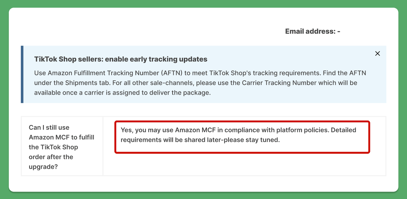 Integrations unaffected: Sellers using the MCF–TikTok integration do not need to take action