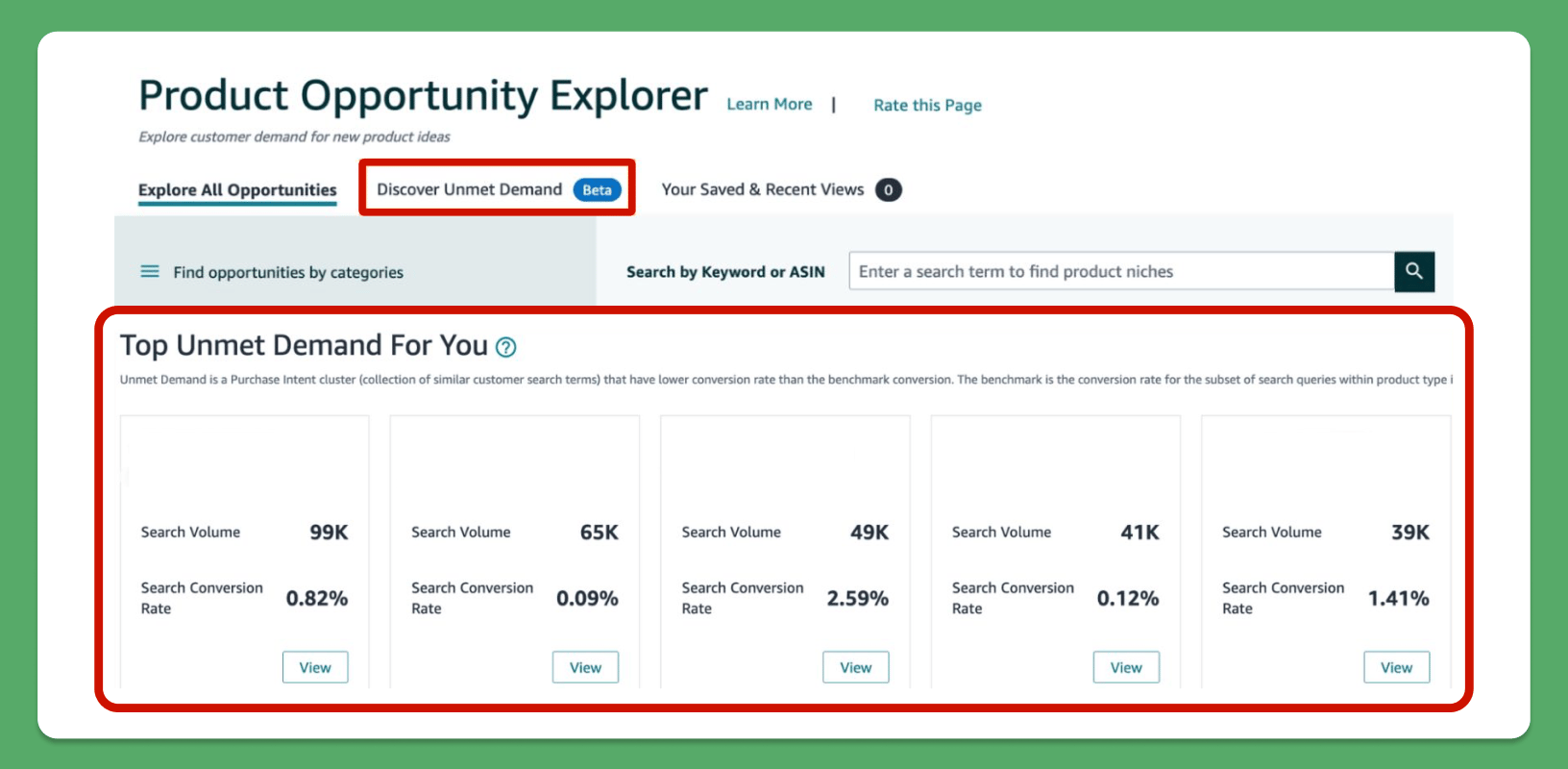 Amazon has launched a beta feature, “Discover Unmet Demand,” in Product Opportunity Explorer. This tool identifies high-demand keyword clusters with low conversion rates, revealing market gaps.
