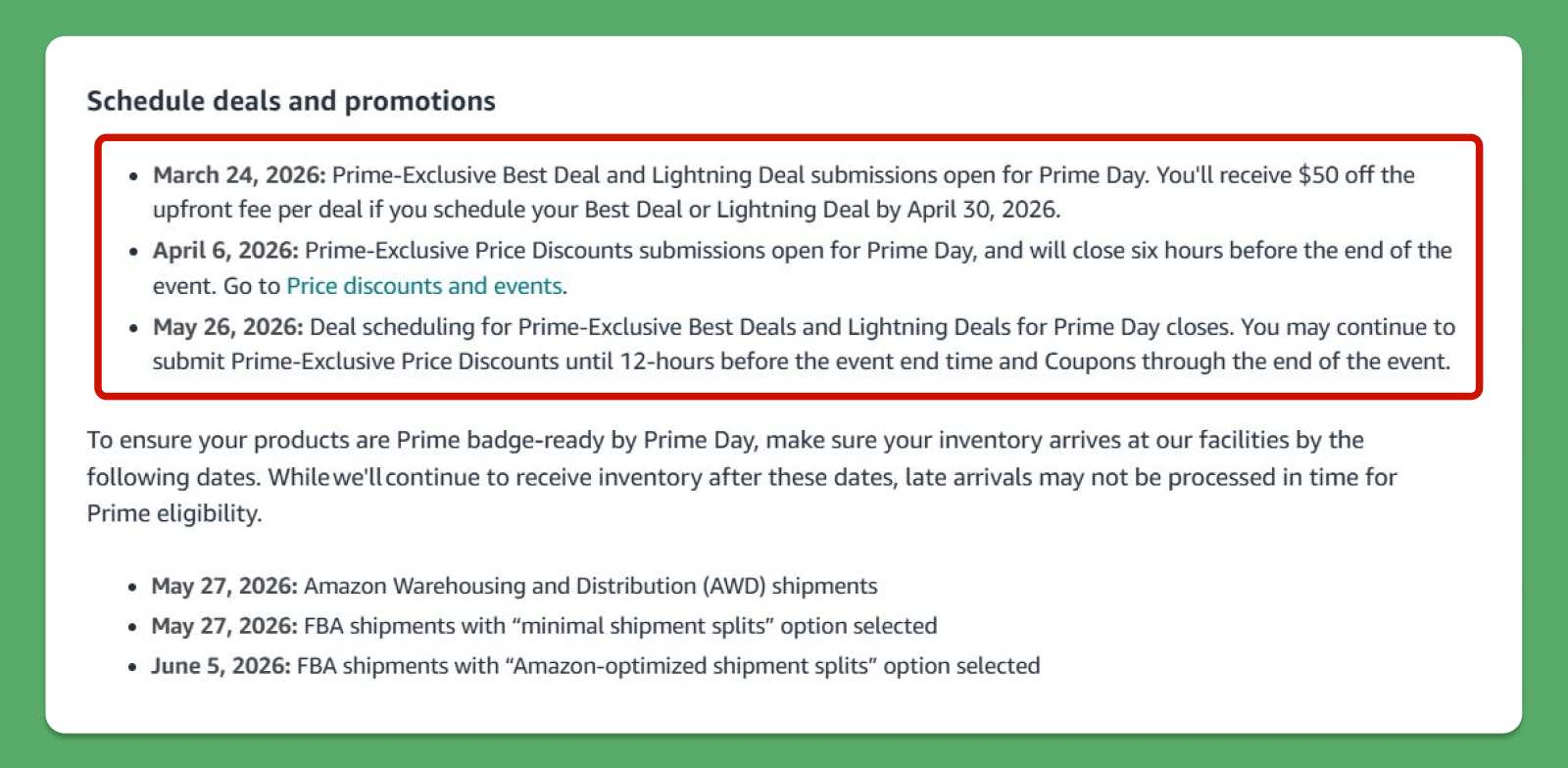Under the new rule, deal pricing must be lower than any price offered in the past 60 days, raising the bar for participation. Inventory must arrive by late May or early June depending on shipment type, making early planning essential to secure Prime Day eligibility.