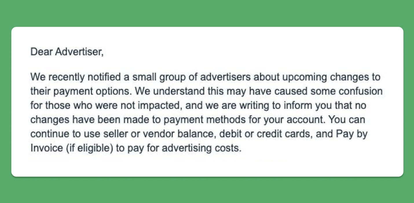 Amazon clarified that recent communication regarding changes to advertising payment methods was directed at a limited group of advertisers. They assured that no modifications have been made to most accounts.