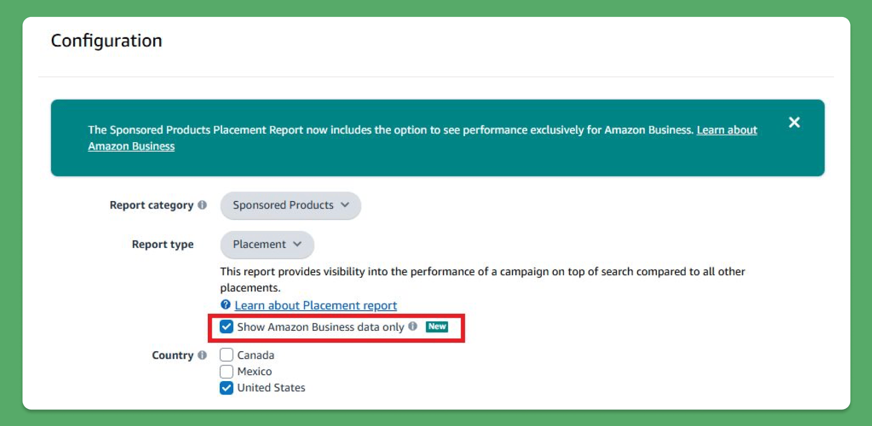 Placement reports now provide a breakdown of Top of Search, Product Pages, and Rest of Search within Amazon Business campaigns.