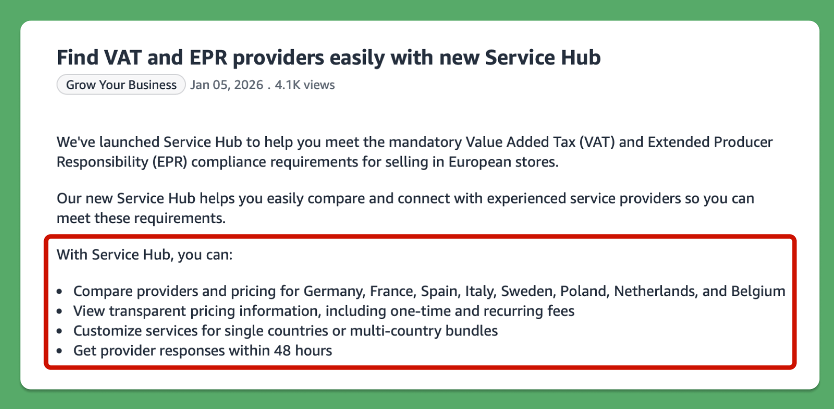 Amazon has introduced Service Hub to help U.S.-based sellers meet VAT and Extended Producer Responsibility (EPR) requirements for selling in European Amazon stores. This tool connects non-EU sellers with vetted third-party providers for EU tax registration, filings, and environmental compliance.